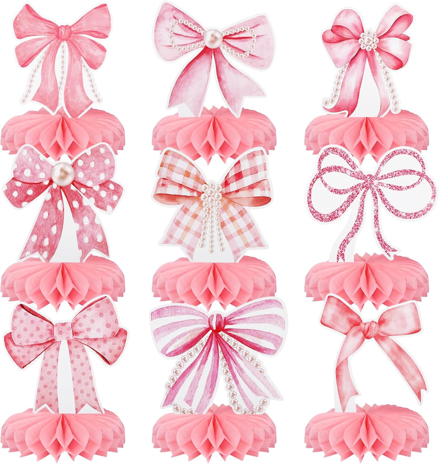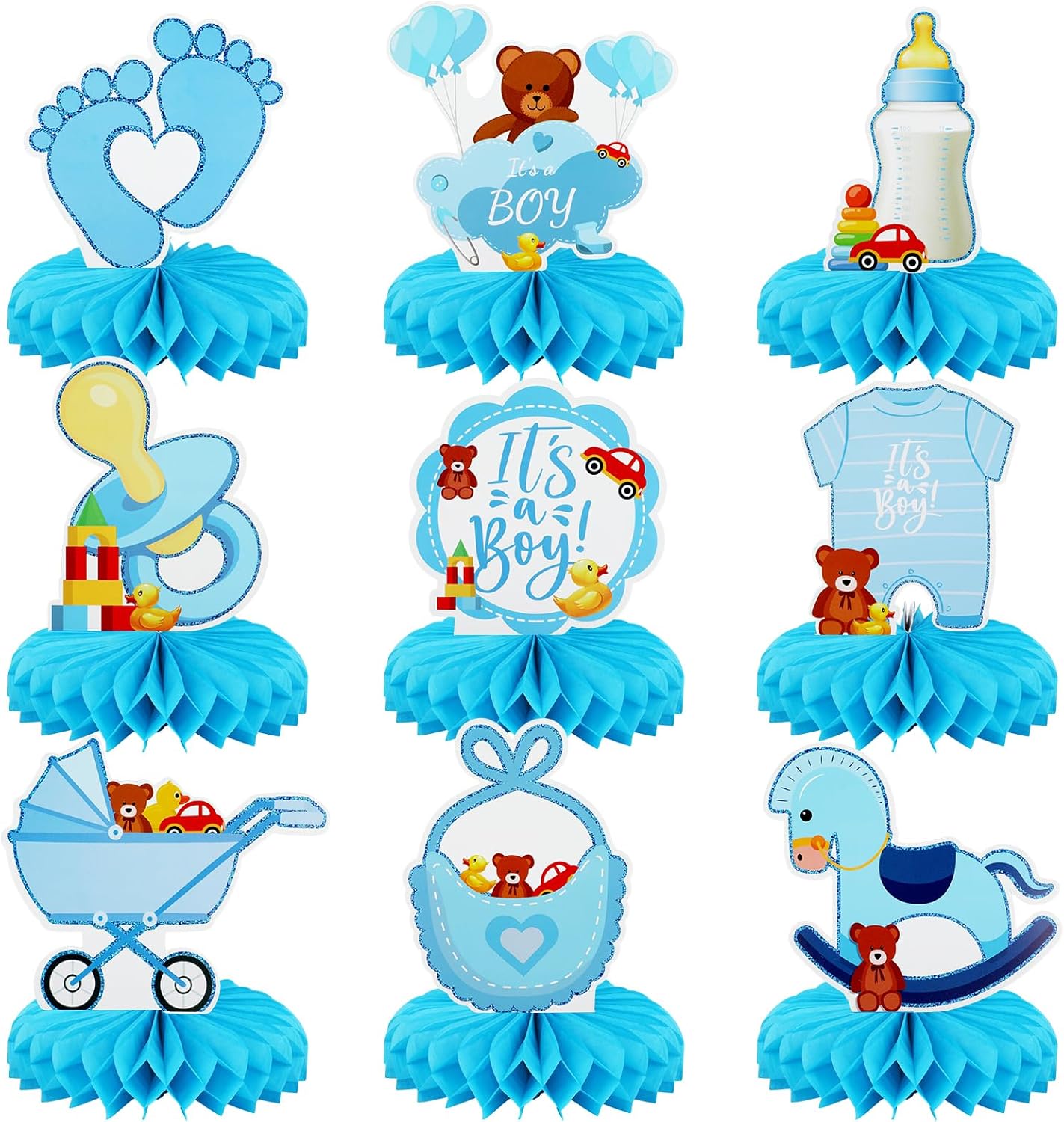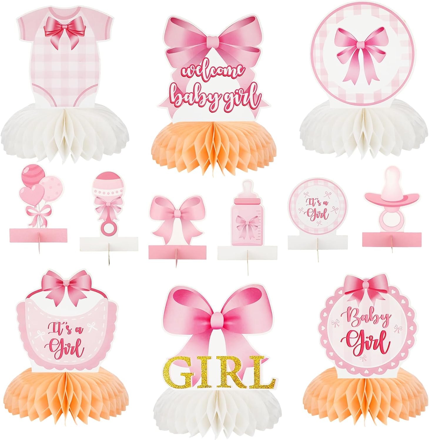 Receive a 9 pcs pink-themed honeycomb centerpieces, It includes baby strollers, baby bottles, jumpsuits, "It's a girl" and so on theme cardboard,perfect for baby girl parties. The set includes various charming designs that will instantly elevate the party decor, creating a happy and festive atmosphere.