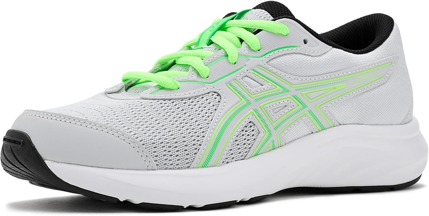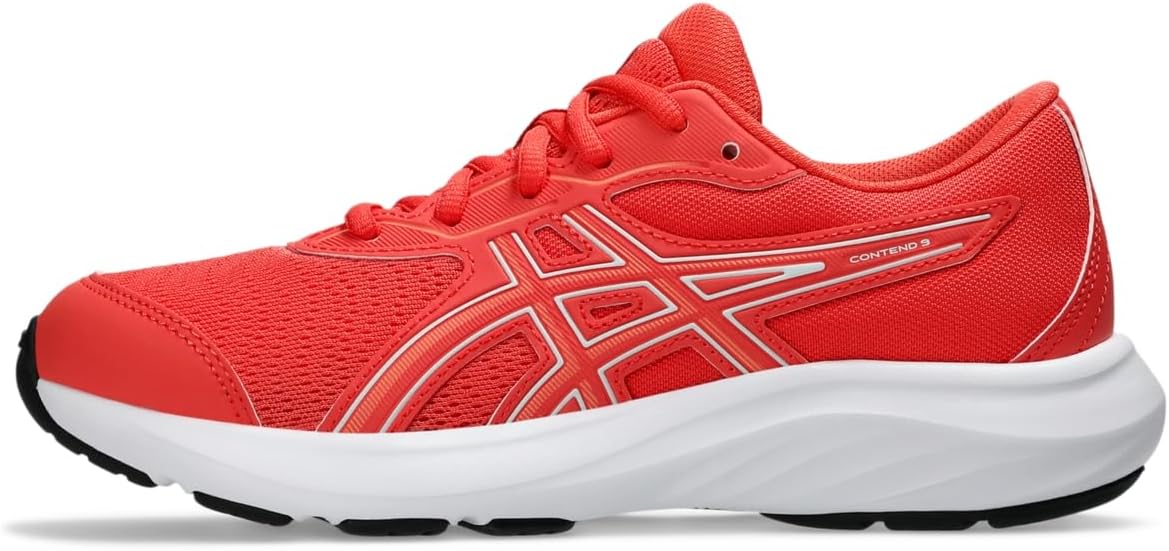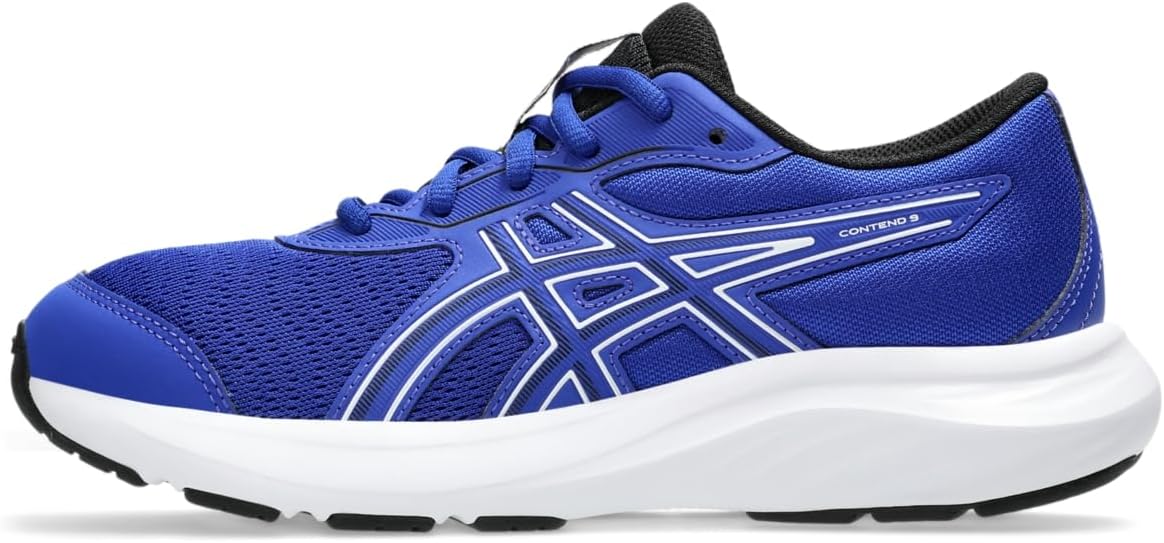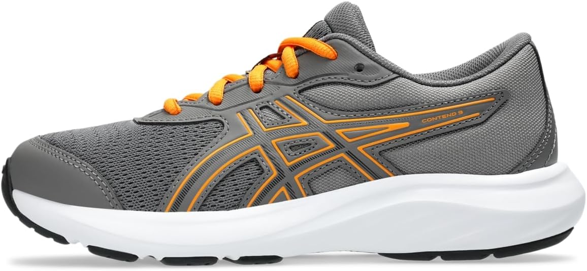 The ASICS Kids CONTEND 9 Grade School Sneaker is designed for young feet. Details like the toe reinforcement, toe rubber stitching, and solid rubber outsole increase durability and lengthen the shoe's lifespan. The lace-up sneaker comes with a mesh upper, polyester lining, and a polyester insole. At least 20% of the shoe's main upper material is made with recycled content to reduce waste and carbon emissions. The sockliner is produced with the solution dyeing process that reduces water usage by approximately 33% and carbon emissions by approximately 45% compared to the conventional dyeing technology. Plus, the signature branding on the side adds an authentic touch. Round toe shape. Low-top design.
