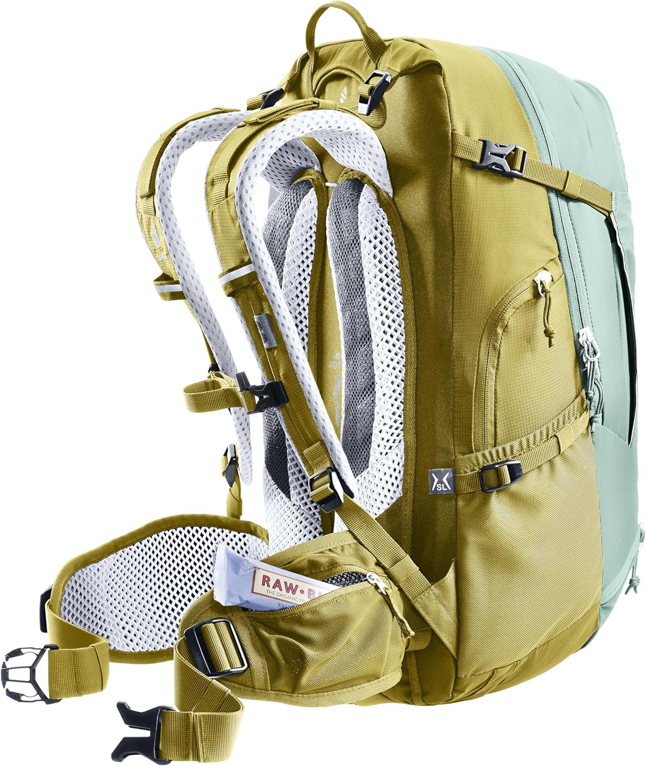 The Trans Alpine is for mountain bikers who are looking for a secure-fitting multi-day backpack with comfortable back ventilation and clever storage options. Thanks to the main material made from recycled materials and environmentally friendly, resource-saving components, the bluesign product meets the Green Button requirement and is also climate-neutral, PFAS-free and thus makes a clear statement in terms of sustainability. Thanks to years of experience and constant further development, the space miracle is one of the most sophisticated products on the market and is often the first choice for crossing the Alps by mountain bike. The well thought-out compartment divisions, such as tool and pump compartments, the functional front pocket, in which the helmet is also safely stowed, and the subdivisible main compartment provide the ideal organisation and quick access that you want on multi-day tours. The air-permeable Airstripes back system guarantees good ventilation of the back and sits compactly on the body even on sporty trails. In addition, the chest strap and ventilated hip fins keep the pack optimally in position, even when the going gets rough.