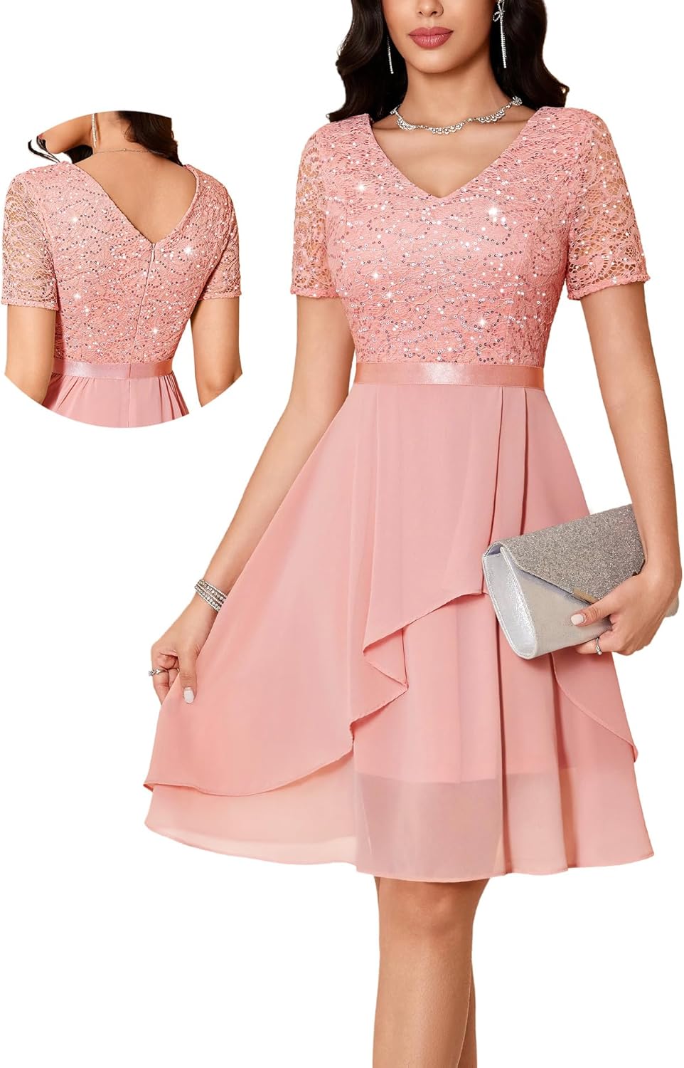 Step into the spotlight this season with our elegant lace & chiffon dress, designed to be your go-to choice for every special occasion. From spring weddings and garden parties to proms, graduations, and evening cocktails, this dress blends timeless style with modern comfort. The flattering A-line silhouette is accentuated by a delicate lace bodice with subtle sequin accents and a graceful double V-neckline – front and back – that elongates your frame. Soft, short sleeves and a smooth elastic waistband ensure a comfortable, customized fit for all-day wear. Crafted from lightweight, breathable chiffon and lined for opacity and structure, the dress moves with you, featuring an asymmetrical front hem for a touch of contemporary flair. Whether you're attending a formal wedding, a semi-formal dinner, a church service, or a festive Easter gathering, its knee-length design offers versatility without compromising elegance. Easy to care for and machine washable, this dress is as practical as it is beautiful — a refined addition to your wardrobe ready for the celebrations of 2026.