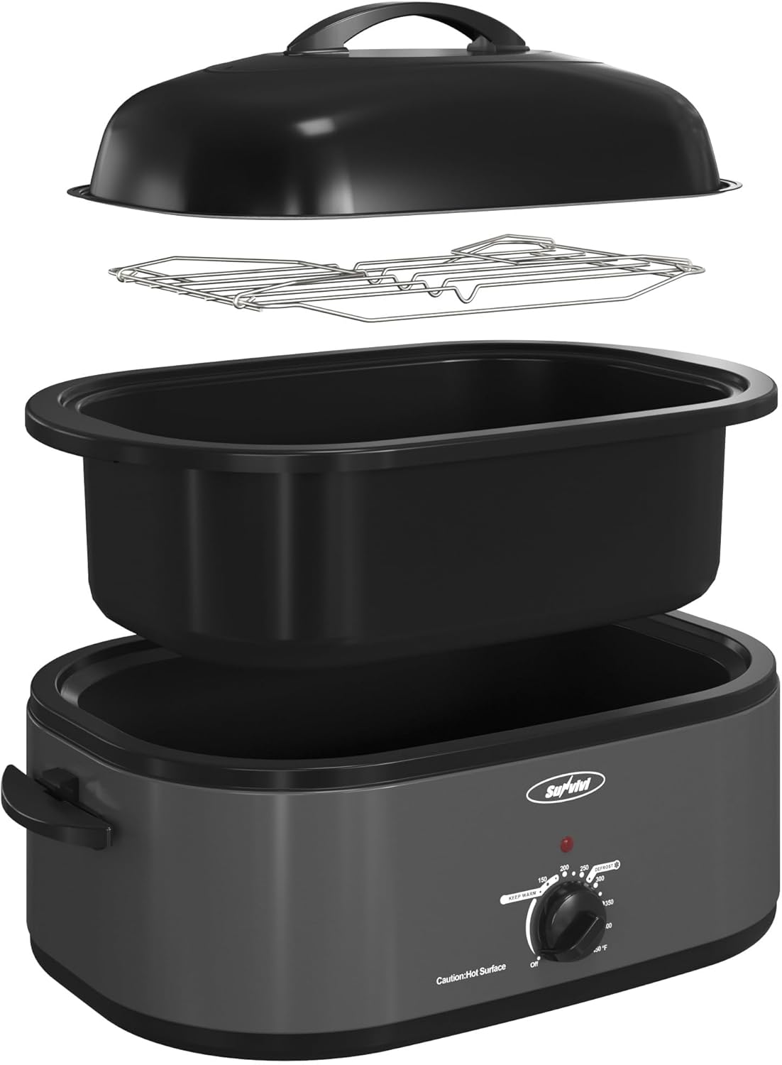 RoyalCraft 22-Quart Electric Roaster Oven with Visible Self-Basting Lid, Turkey Roaster Oven with Removable Pan and Rack, Perfect for Large Meals and Holiday Feasts, Silver